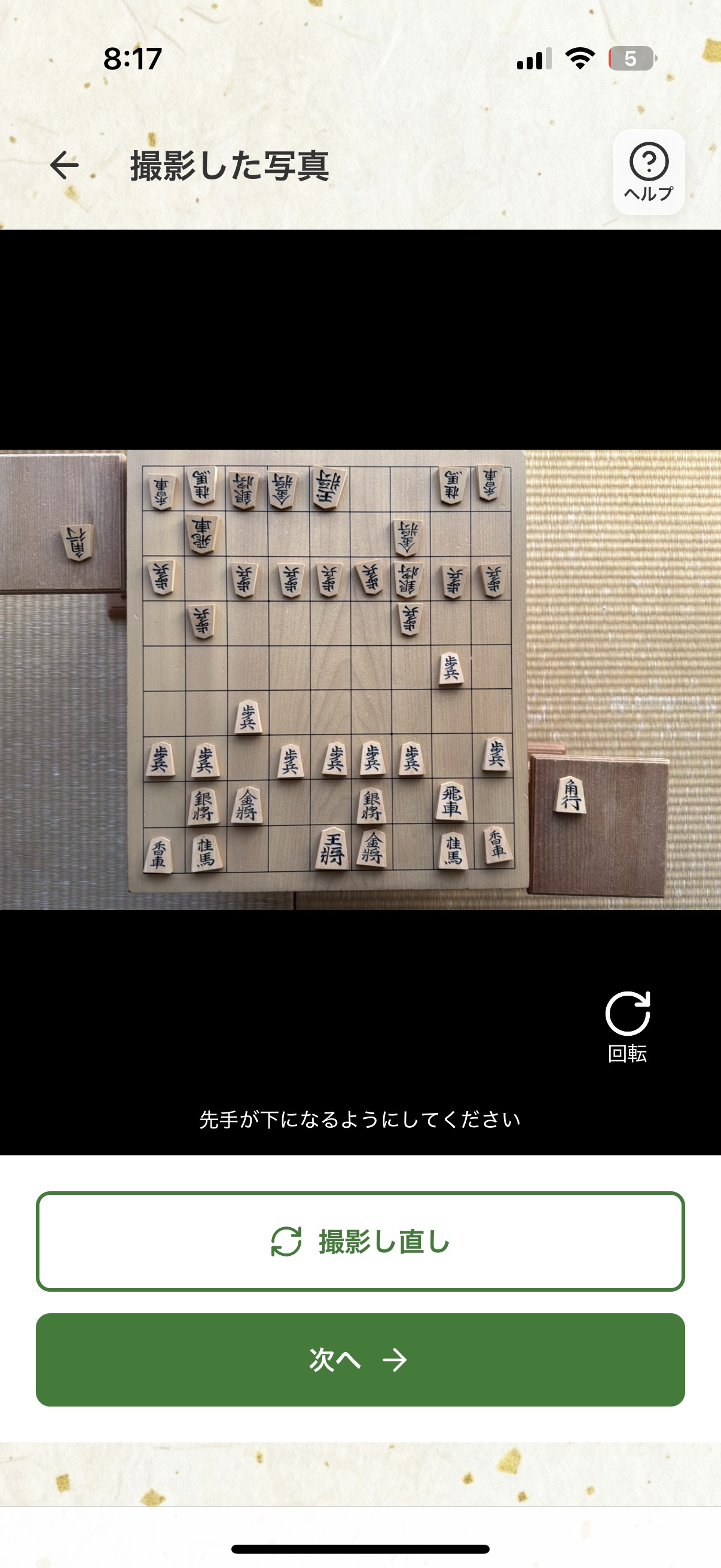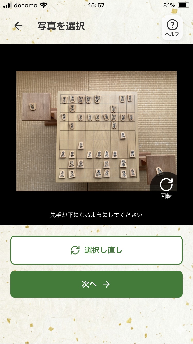 写真を撮影したら、先手が下になるように画像を回転してから「次へ」ボタンを押してください。