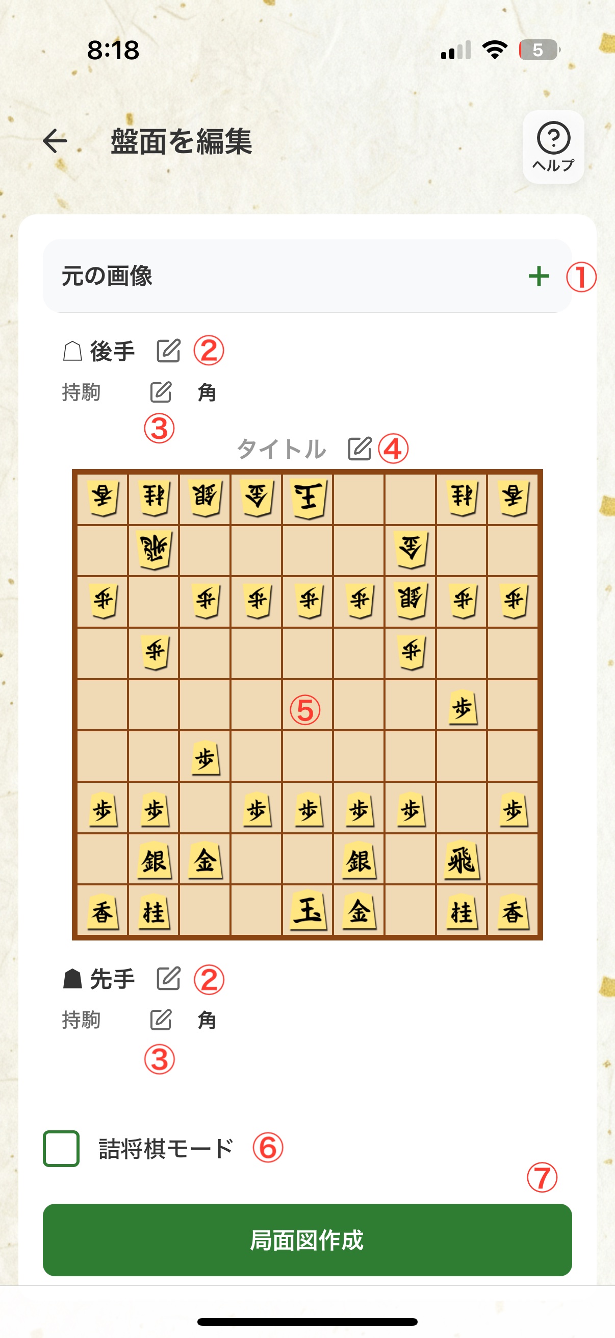 ⑦局面図を作成するボタンです。盤面上と持駒欄に正しく駒が配置されたのを確認したら、このボタンを押してください。